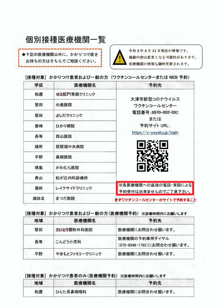 新型コロナワクチン接種の個別接種開始について(2021.06.07現在の医療機関一覧)