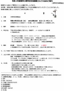 2022年4月24日 / 最終更新日時 : 2022年12月2日 officer 体育協会 20220424 イベント案内(体育協会) 新型コロナ感染の影響で変更があるかも知れません。 ご了承の上、奮ってご参加ください。 小野学区グルンド・ゴルフ大会 春季小野学区民親睦ゴルフ大会 小野学区男女混合ソフトボール大会 FacebookXHatenaCopy
