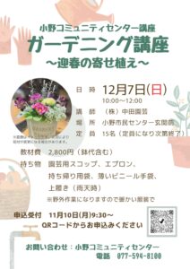 2025年11月4日 / 最終更新日時 : 2025年11月4日 officer 小野コミュニティセンターだより など 「ガーデニング講座 ~迎春の寄せ植え~」のご案内 いつも好評、お待ちかね、恒例の 「ガーデニング講座 ~迎春の寄せ植え~」のご案内です。 お申し込み、お待ちしています。 FacebookXHatenaCopy
