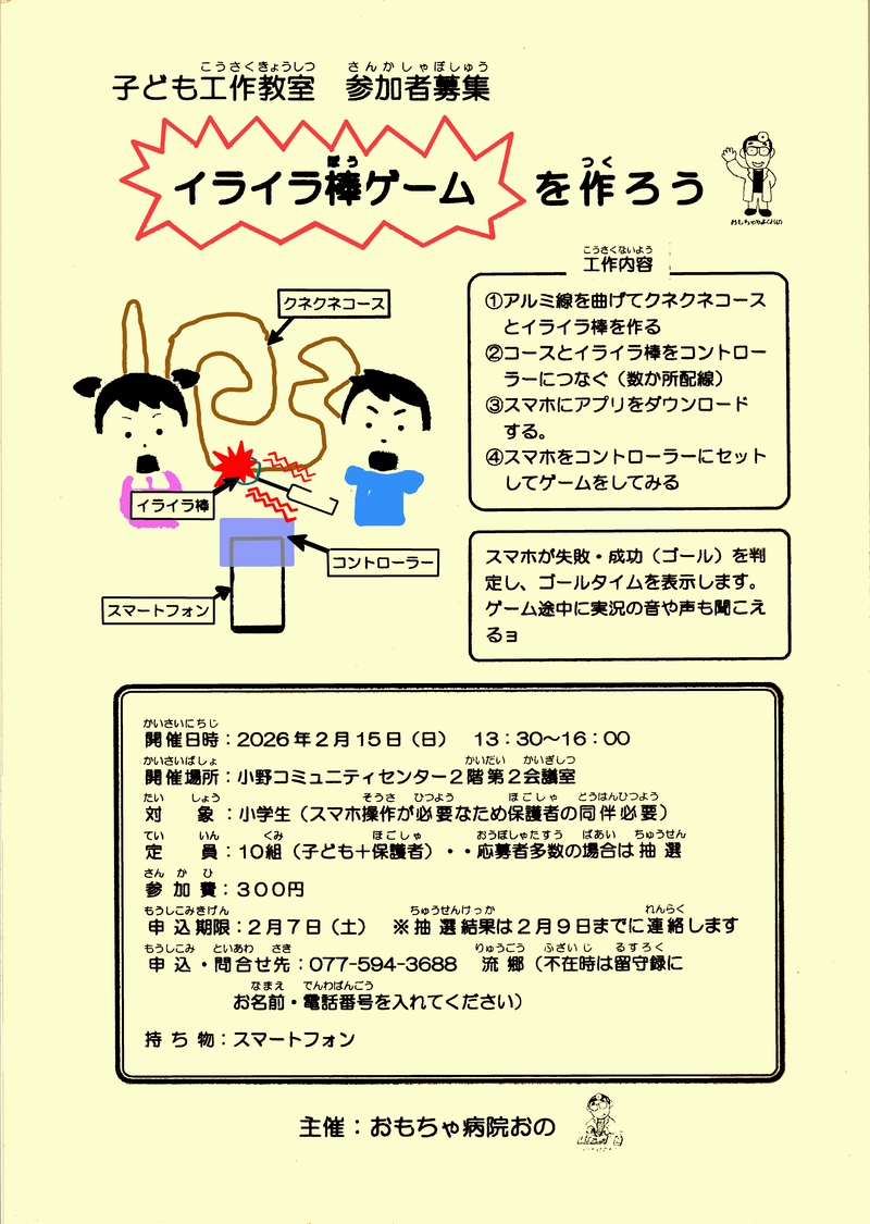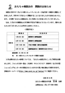 2025年12月27日 / 最終更新日時 : 2025年12月27日 officer 小野コミュニティセンターだより など イライラ棒ゲームを作ろう (「おもちゃの病院」) こどもたちに頼られ、親しまれてきた「おもちゃの病院」が今年度でその活動を一旦終了するそうです。このお知らせが最後の案内になるかもしれません。 長い間御苦労様でした。子どもたちとともに感謝申し上げます。 FacebookXHatenaCopy